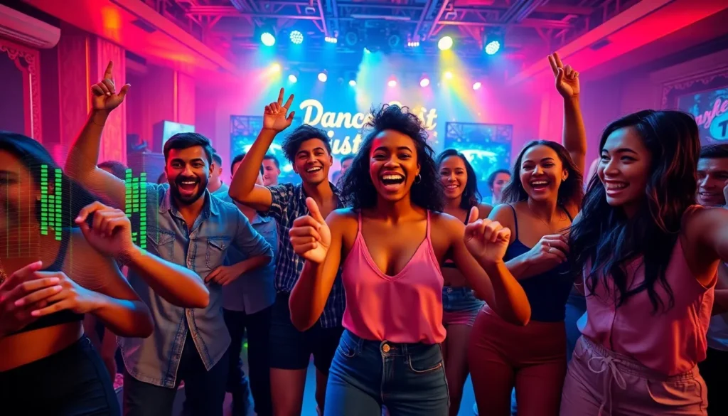 diverse dancers celebrating in a lively urban nightlife scene.
